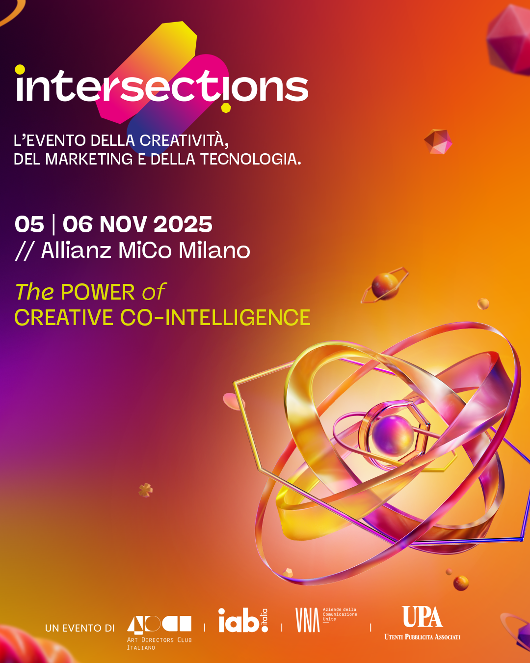 Intersections nasce dalla volontà congiunta di ADCI, IAB Italia e UNA, a cui quest’anno si unisce anche UPA (Utenti Pubblicità Associati). L’ingresso di UPA rafforza la dimensione istituzionale e strategica dell’evento, che punta a costruire una visione integrata e condivisa del futuro della comunicazione, promuovendo sinergie concrete tra creatività, dati e innovazione.
